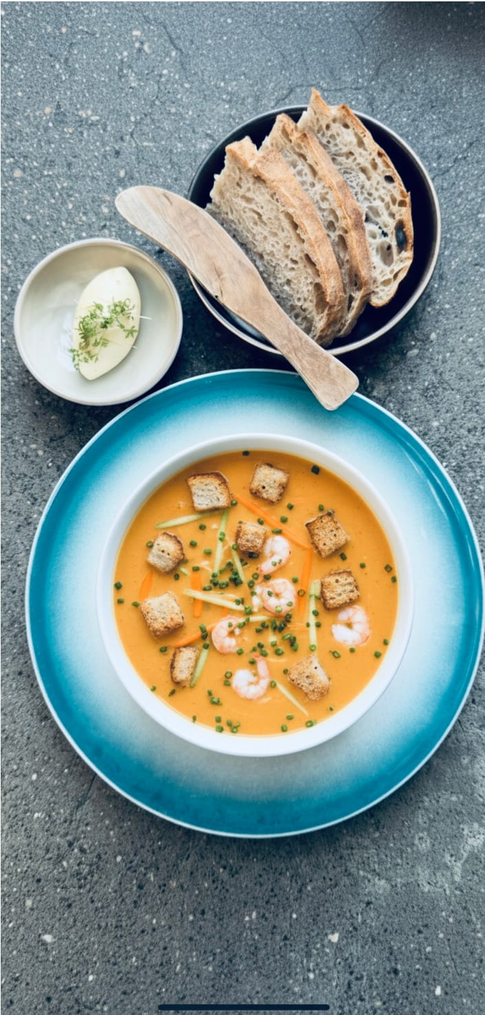 Kremet skalldyrsuppe med reker, fisk og grønnsaker.